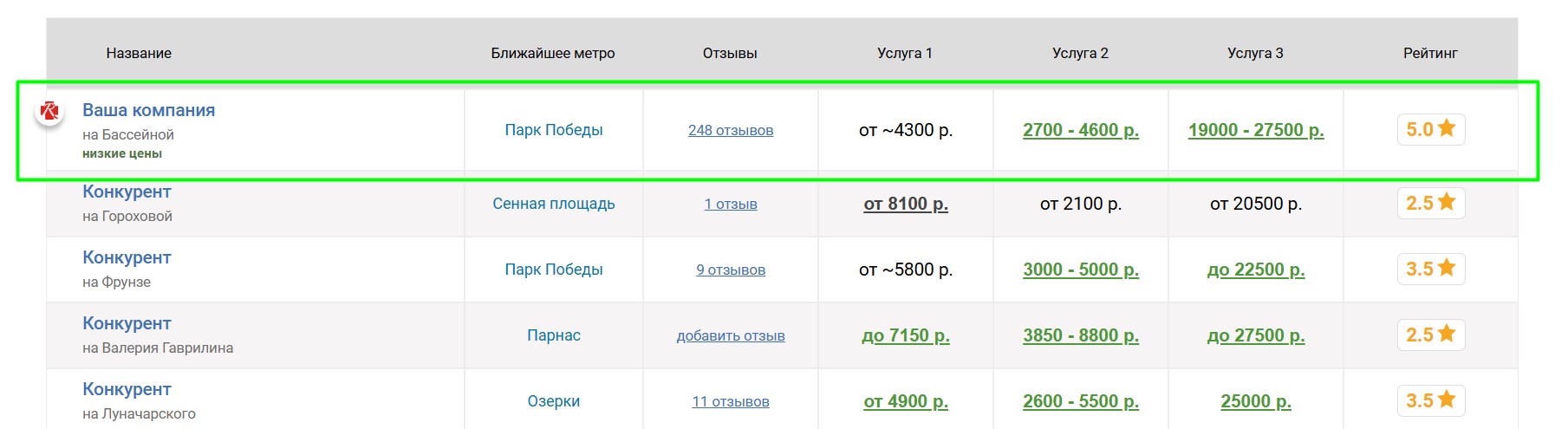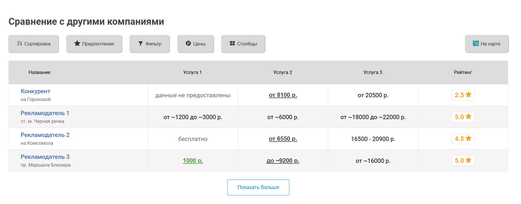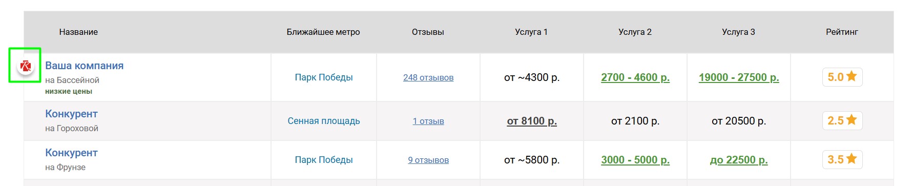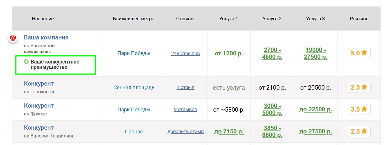 мотосервисов, продвигаемый мотосервис попадёт к ним в таблицу «Сравнение по ценам», которая выглядит следующим образом: