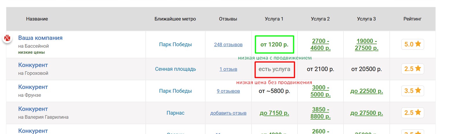 Если низкие цены — ваше конкурентное преимущество, их можно выделить. Размещение цен ниже определённого лимита является платным: чем ниже цена, тем дороже размещение. Стоимость и лимит зависят от конкретной услуги.